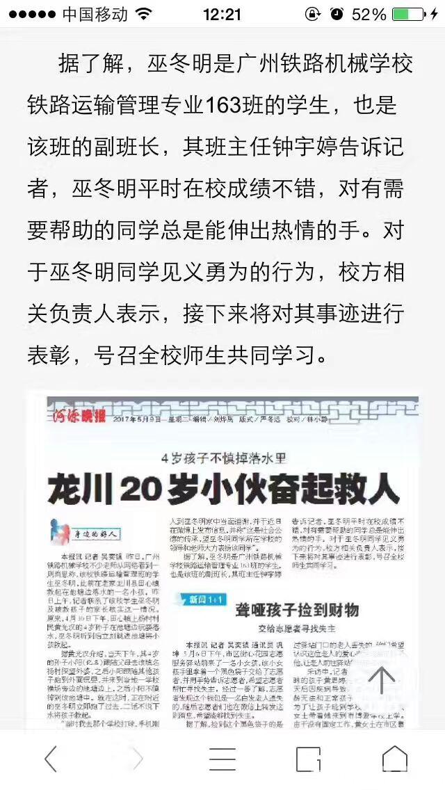 转发河源晚报关于我校巫东明同学下水救人的报道